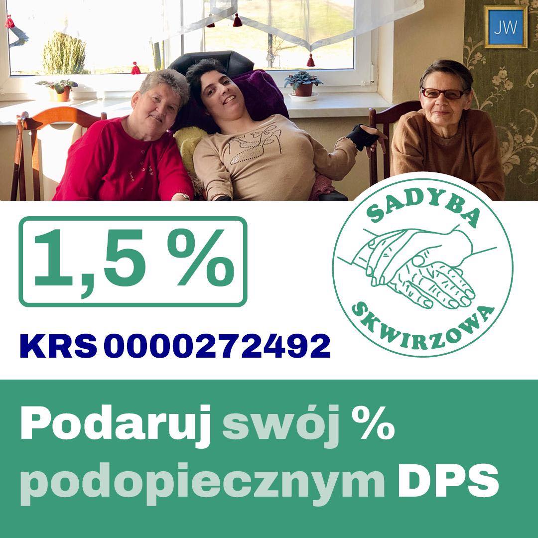Fundacja Sadyba prowadzi Dom Pomocy Społecznej w Skwirzowej – to miejsce, gdzie osoby starsze, niepełnosprawne i chore zyskują dom pełen troski, zrozumienia i godnej opieki.Jesteśmy organizacją pożytku publicznego – dzięki temu można nam przekazać 1,5% podatku, wybierając KRS 0000272492. Każda wpłata to realna pomoc: posiłki, opieka medyczna, zakup sprzętu rehabilitacyjnego, wsparcie i spokojne warunki dla mieszkańców.Jeśli opowiadasz się za wartościami: miłością bliźniego, wspólnotą, wzajemnym szacunkiem – Twój 1,5% może być realnym wsparciem dla kogoś, kto potrzebuje pomocy.